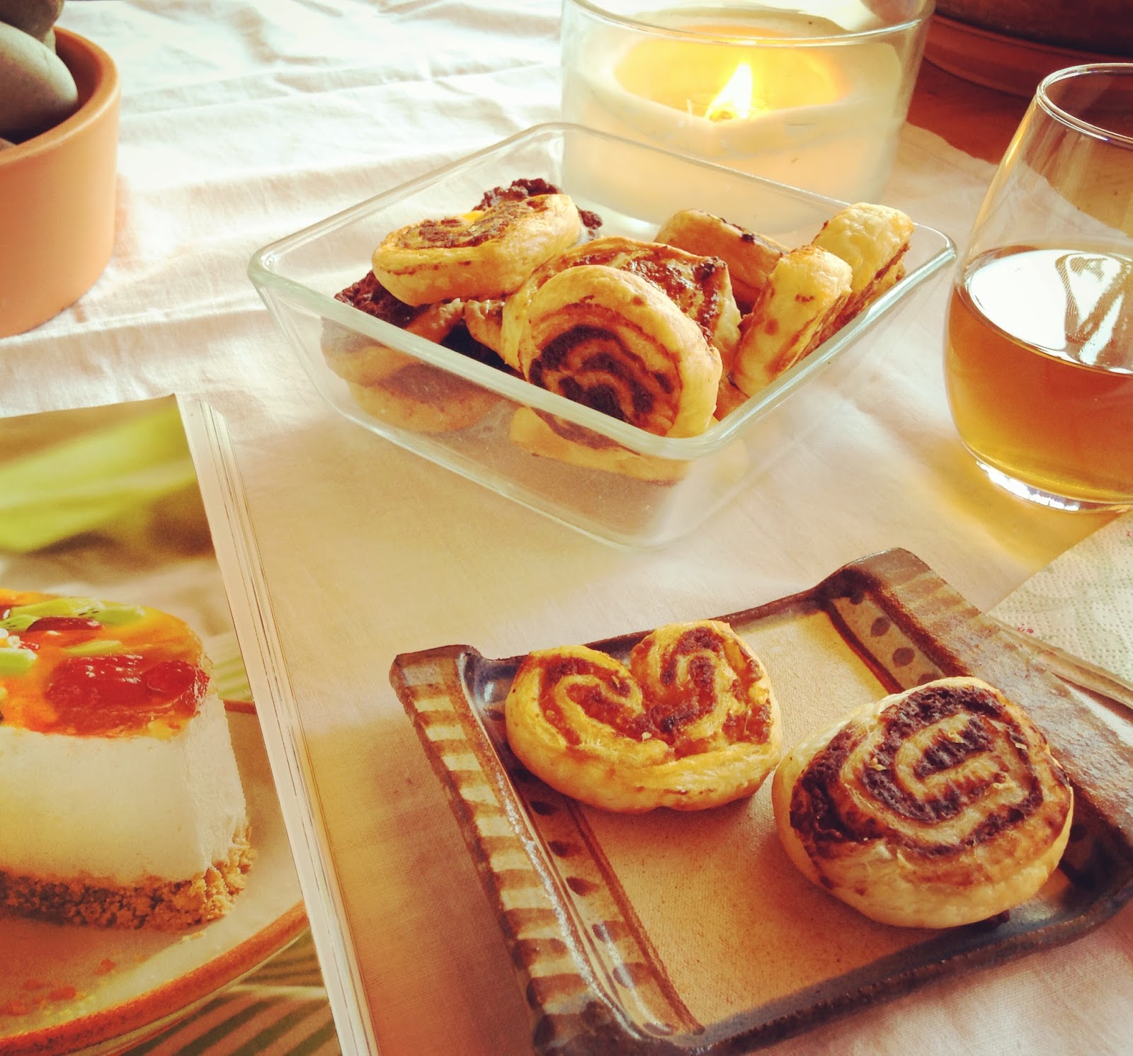 De hecho es de estas recetas que tardas más en explicar que en hacer y como yo no puedo quedarme ahí, tuve que complicarme un poco la vida y pensando en posibles cenas veraniegas, de estas en las que se reunen los amigos o el vecindario y cada cuál lleva una cosa, lo que viene siendo una cena de traje, vaya, me saqué de la manga estas palmeritas con un poco más de fundamento, que diría aquél ;-)